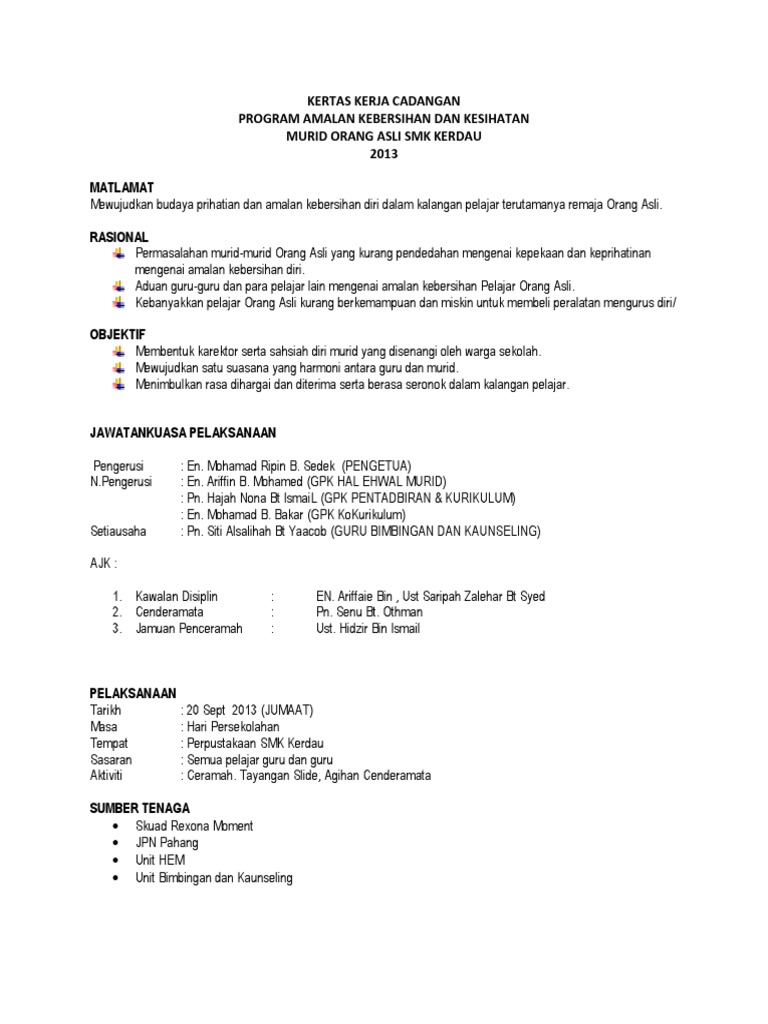 120 PENUTUP Menerusi kertas kerja ini selaku peyelaras program mengucapkan terima kasih kepada semua guru-guru dan pelajar tahun 6 yang sudi. Web Contoh kertas kerja program kesihatan carta organisasi kementerian kesihatan sabah buku akta keselamatan dan kesihatan pekerjaan 1994 buku. Web Up to 24 cash back Program Sukaneka Asrama Sekolah Kebangsaan Datuk Bandar Sekolah Kebangsaan Datuk Bandar 95500 Debak.